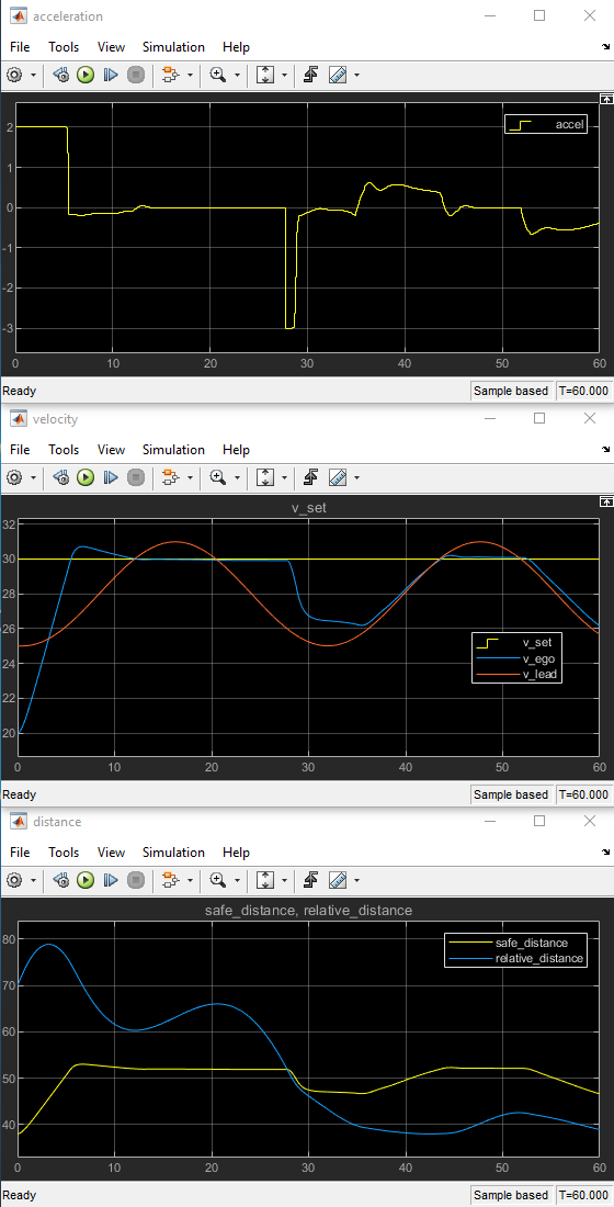 С 28 до 60 секунд относительное расстояние меньше безопасного расстояния (нижний график), поэтому трамвайные пути эго минимум ведущей скорости и скорости набора. С 28 до 36 секунд ведущая скорость меньше скорости набора (средний график). Чтобы замедлиться и отследить ведущую автомобильную скорость, ускорение отрицательно (главный график). С 36 до 60 секунд автомобиль эго настраивает свое ускорение, чтобы отследить ссылочную скорость тесно (средний график). В этом временном интервале трамвайные пути эго скорость набора с 43 до 52 секунд и дорожек приводит скорость с 36 до 43 секунд и 52 - 60 секунд.