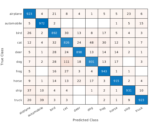 sortClasses(cm, ... ["cat" "dog" "horse" "deer" "bird" "frog", ... "airplane" "ship" "automobile" "truck"])