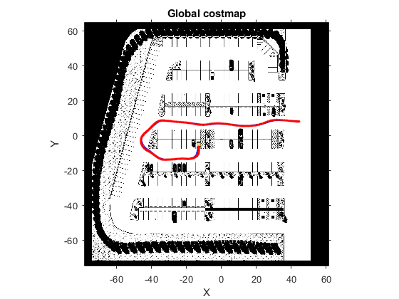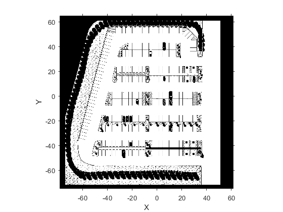 % Get the left-bottom corner location of the map mapLocation = [sceneRef.XWorldLimits(1), sceneRef.YWorldLimits(1)]; % [meters, meters] % Compute resolution mapWidth = sceneRef.XWorldLimits(2)-sceneRef.XWorldLimits(1); % meters cellSize = mapWidth/size(sceneImageBinary, 2); % Create the costmap costmap = vehicleCostmap(im2single(sceneImageBinary), 'CellSize', cellSize, 'MapLocation', mapLocation); figure plot(costmap, 'Inflation', 'off'); legend off