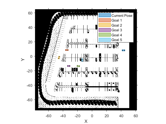 data = load('routePlanUnreal.mat'); routePlan = data.routePlan %#ok<NOPTS> % Plot vehicle at the starting pose startPose = routePlan.StartPose(1,:); hold on helperPlotVehicle(startPose, vehicleDims, 'DisplayName', 'Current Pose') legend for n = 1 : height(routePlan) % Extract the goal waypoint vehiclePose = routePlan{n, 'EndPose'}; % Plot the pose legendEntry = sprintf('Goal %i', n); helperPlotVehicle(vehiclePose, vehicleDims, 'DisplayName', legendEntry); hold on end hold off