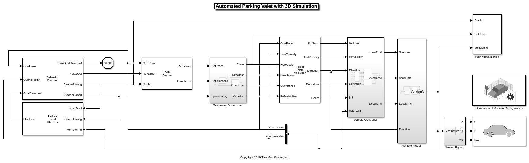 Automated Driving Toolbox интегрирует 3D среду симуляции в Simulink. 3D среда симуляции использует Нереальный Engine® Epic Games®. Можно использовать этот механизм, чтобы визуализировать движение транспортного средства в предварительно созданной 3D сцене. Этот механизм обеспечивает интуитивный способ анализировать производительность алгоритмов управления транспортного средства и планирования пути. Автоматизированный Камердинер Парковки в примере Simulink показывает, как спроектировать планирование пути и алгоритм управления транспортного средства для автоматизированной системы камердинера парковки в Simulink. В этом примере показано, как увеличить модель, чтобы визуализировать движение транспортного средства в сцене с помощью 3D механизма визуализации. Шаги в этом рабочем процессе: