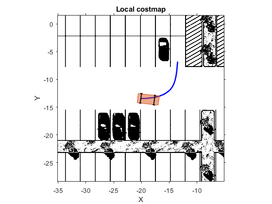 Парковка Режима: Использует локальный costmap в итоговом маневре парковки. Локальный costmap является подкартой costmap с квадратной формой. Чтобы задать размер этой карты, используйте Локальный costmap размер (m) параметр диалогового окна блока Планировщика Пути. costmap с меньшими размерностями значительно уменьшает нагрузку расчета в поиске выполнимого пути к итоговому месту для парковки. Это также увеличивает вероятность нахождения выполнимого пути, учитывая те же настройки планировщика.