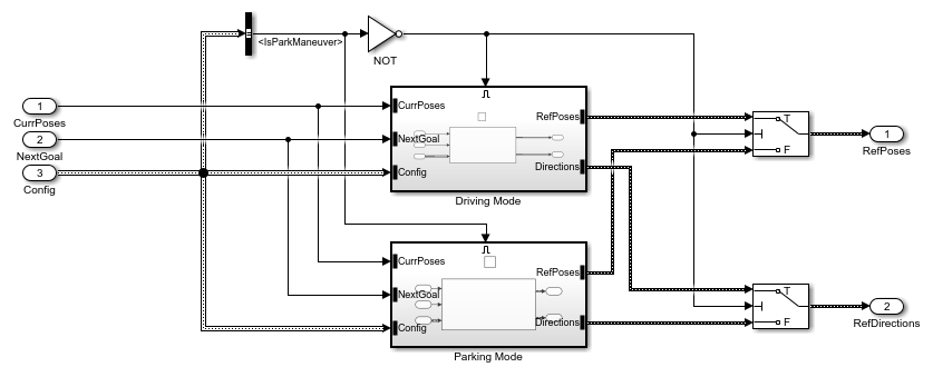 Два модуля планировщика пути реализованы как Enabled блоки Subsystem. Разрешать сигнал от IsParkingManeuver сигнал во входе Config шина отправляется от блока Behavior Planner. Когда подсистема Режима Парковки включена, локальный costmap создается с центром как текущее положение транспортного средства.