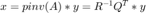 где pinv () представляет псевдоинверсию. Учитывая матрицу А, следующий код может использоваться, чтобы реализовать решение этого матричного уравнения. Факторинг A позволяет для более легкого решения системы.