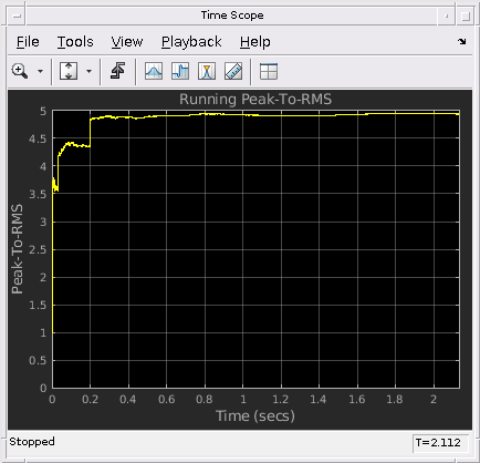meanScope = dsp.TimeScope('SampleRate',Fs,... 'TimeSpan',numFrames*frameSize/Fs,... 'TimeSpanOverrunAction','Scroll',... 'BufferLength',numFrames*frameSize,... 'ShowGrid',true,... 'Title','Running Mean',... 'YLabel','Mean',... 'YLimits',[-0.1 .1],... 'Position',[43 308 420 330]); p2rmsScope = dsp.TimeScope('SampleRate',Fs,... 'TimeSpan',numFrames*frameSize/Fs,... 'TimeSpanOverrunAction','Scroll',... 'BufferLength',numFrames*frameSize,... 'ShowGrid',true,... 'Title','Running Peak-To-RMS',... 'YLabel','Peak-To-RMS',... 'YLimits',[0 5],... 'Position',[480 308 420 330]); minmaxScope= dsp.TimeScope('SampleRate',Fs,... 'TimeSpan',numFrames*frameSize/Fs,... 'TimeSpanOverrunAction','Scroll',... 'BufferLength',3*numFrames*frameSize,... 'ShowGrid',true,... 'Title',... 'Signal with Running Minimum and Maximum',... 'YLabel','Signal Amplitude',... 'YLimits',[-3 3],... 'Position',[43 730 422 330]); spectrumScope = dsp.ArrayPlot('SampleIncrement',... .5 * Fs/(frameSize/2 + 1 ),... 'PlotType','Line',... 'Title','Power Spectrum Density',... 'XLabel','Frequency (Hz)',... 'YLabel','Power/Frequency (dB/Hz)',... 'YLimits',[-120 -30],... 'Position',[475 730 420 330]);