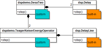 В dspdemo. DesaTwo, заметьте, например, присутствие двух экземпляров dspdemo. TeagerKaiserOperator, один для