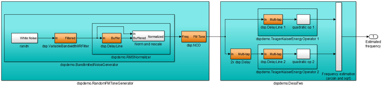 Оператор оценки частоты DESA-2 (dspdemo. DesaTwo), снова реализован как пользовательский Системный объект. На этот раз, хотя его метод шага принимает буфер выборок, как введено, и он возвращает локальные оценки тональной амплитуды и частоты. При сравнении уравнений для оператора с одной стороны и диаграммы классов на другом, заметьте, как оператор DESA-2 состоит из двух энергетических операторов Teager-кайзера типа TeagerKeiserEnergyOperator, как ранее ожидается путем визуального осмотра схемы уровня системы.