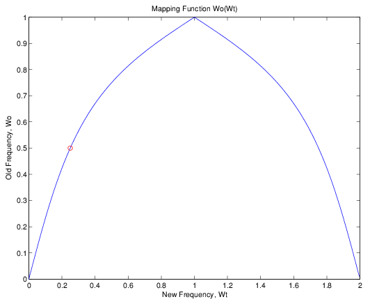 Wo = 0.5; Wt = 0.25; [AllpassNum, AllpassDen] = allpasslp2lp(Wo, Wt); [h, f] = freqz(AllpassNum, AllpassDen, 'whole'); plot(f/pi, abs(angle(h))/pi, Wt, Wo, 'ro'); title('Mapping Function Wo(Wt)'); xlabel('New Frequency, Wt'); ylabel('Old Frequency, Wo');