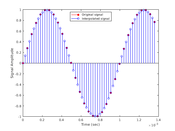 gainCIC = ... (cicint.InterpolationFactor*cicint.DifferentialDelay)... ^cicint.NumSections/cicint.InterpolationFactor; stem(n(1:31)/Fs, double(x(1:31)),'r','filled') hold on; stem(n(1:61)/(Fs*cicint.InterpolationFactor), ... double(y(1,4:end))/gainCIC,'b') xlabel('Time (sec)') ylabel('Signal Amplitude') legend('Original signal','Interpolated signal',... 'location','north') hold off;