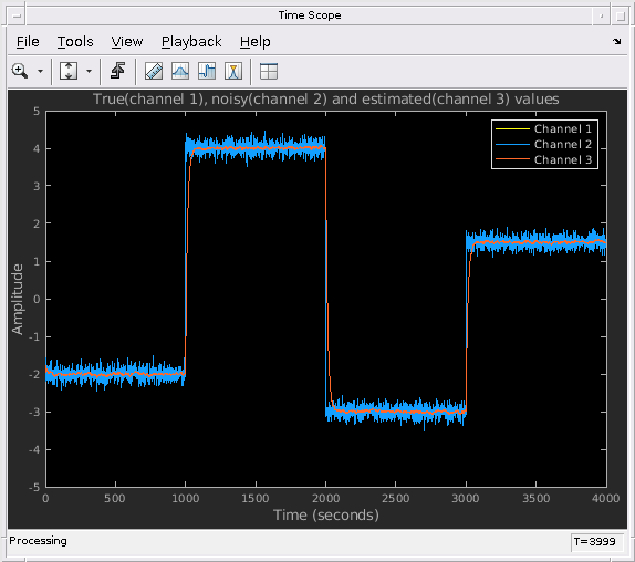 [ выполняет итеративный алгоритм Фильтра Калмана по измерениям zEst, xEst, MSE_Est, zPred, xPred, MSE_Pred] = kalman(z,u)z и управление вводит u. Столбцы в z и u обработаны как входные параметры, чтобы разделить параллельные фильтры, коррекция которых (или обновление) шаг может быть отключен DisableCorrection свойство. Возвращенные значения являются оцененными измерениями zEst, предполагаемые состояния xEst, MSE предполагаемых состояний MSE_Est, предсказанные измерения zPred, предсказанные состояния xPred, и MSE предсказанных состояний MSE_Pred.