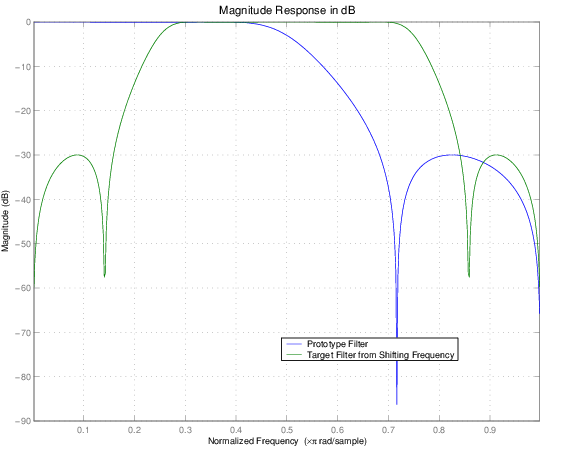 Выполните действительный сдвиг частоты путем определения где выбранная функция прототипного фильтра, первоначально в Wo=0.5, должен быть помещен в целевой фильтр, Wt=0.75: