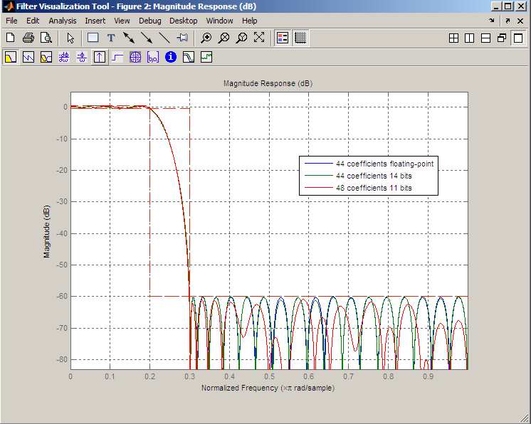 f=fdesign.lowpass('Fp,Fst,Ap,Ast',0.2,0.3,1,60); % Design filter with double-precision floating point Hd=design(f,'equiripple'); % Find minimum wordlength fixed-point filter % with 0.15 dB stopband tolerance Hq=minimizecoeffwl(Hd,'MatchRefFilter',true,'Astoptol',0.15); Hq1=minimizecoeffwl(Hd,'Astoptol',0.15); % Hq.coeffwordlength is 14 bits. % Hq1.coeffwordlength is 11 bits hfvt=fvtool(Hd,Hq,Hq1,'showreference','off'); legend(hfvt,'44 coefficients floating-point',... '44 coefficients 14 bits','48 coefficients 11 bits');