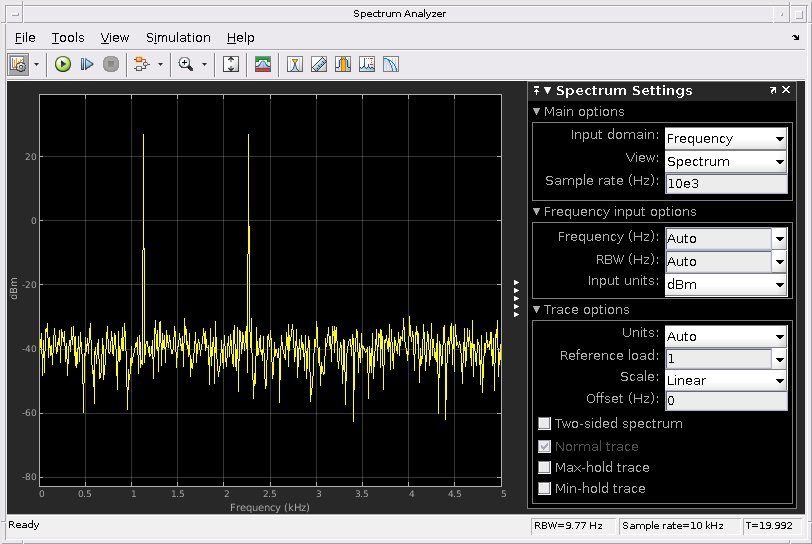 Type — Тип спектра, чтобы отобразитьсяPower (значение по умолчанию) | Power density | RMSPower — Спектр Анализатор показывает спектр мощности.