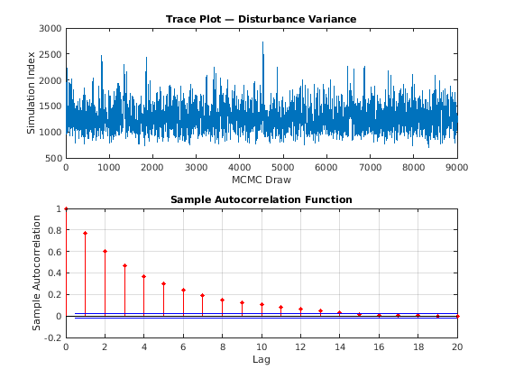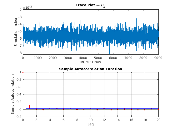figure; subplot(2,1,1) plot(PosteriorMdl.BetaDraws(2,1001:end)); title(['Trace Plot ' char(8212) ' \beta_1']); xlabel('MCMC Draw') ylabel('Simulation Index') subplot(2,1,2) autocorr(PosteriorMdl.BetaDraws(2,1001:end)) figure; subplot(2,1,1) plot(PosteriorMdl.Sigma2Draws(1001:end)); title(['Trace Plot ' char(8212) ' Disturbance Variance']); xlabel('MCMC Draw') ylabel('Simulation Index') subplot(2,1,2) autocorr(PosteriorMdl.Sigma2Draws(1001:end))