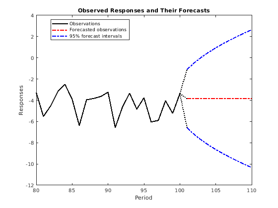 ForecastIntervals(:,1) = ForecastedY - 1.96*sqrt(YMSE); ForecastIntervals(:,2) = ForecastedY + 1.96*sqrt(YMSE); figure plot(T-20:T,y(T-20:T),'-k',T+1:T+numPeriods,ForecastedY,'-.r',... T+1:T+numPeriods,ForecastIntervals,'-.b',... T:T+1,[y(end)*ones(3,1),[ForecastedY(1);ForecastIntervals(1,:)']],':k',... 'LineWidth',2) hold on title({'Observed Responses and Their Forecasts'}) xlabel('Period') ylabel('Responses') legend({'Observations','Forecasted observations','95% forecast intervals'},... 'Location','Best') hold off