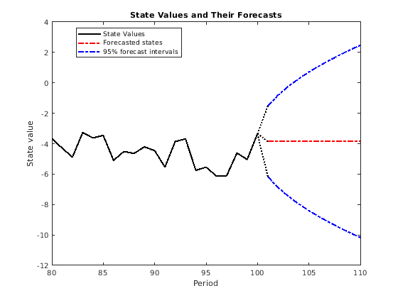 ForecastIntervals(:,1) = ForecastedX - 1.96*sqrt(XMSE); ForecastIntervals(:,2) = ForecastedX + 1.96*sqrt(XMSE); figure plot(T-20:T,x(T-20:T),'-k',T+1:T+numPeriods,ForecastedX,'-.r',... T+1:T+numPeriods,ForecastIntervals,'-.b',... T:T+1,[x(end)*ones(3,1),[ForecastedX(1);ForecastIntervals(1,:)']],':k',... 'LineWidth',2) hold on title({'State Values and Their Forecasts'}) xlabel('Period') ylabel('State value') legend({'State Values','Forecasted states','95% forecast intervals'},... 'Location','Best') hold off