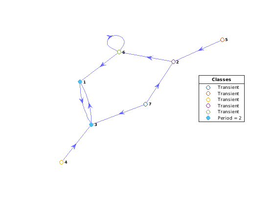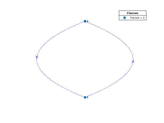 [bins,ClassStates,ClassRecurrence,ClassPeriod] = classify(mc) дополнительно возвращает состояния в каждом классе (ClassStates), являются ли классы текущими (ClassRecurrence), и периоды класса (ClassPeriod).