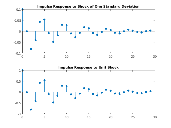 filter обобщает simulate. Оба фильтруют серию ошибок произвести ответы (Y), инновации (E), и безусловные воздействия (U). Однако simulate автоматически генерирует серию среднего нуля, модульного отклонения, независимых и тождественно распределенных (iid) ошибок согласно распределению в Mdl. В отличие от этого filter требует, чтобы вы задали свои собственные ошибки, которые могут прибыть из любого распределения.