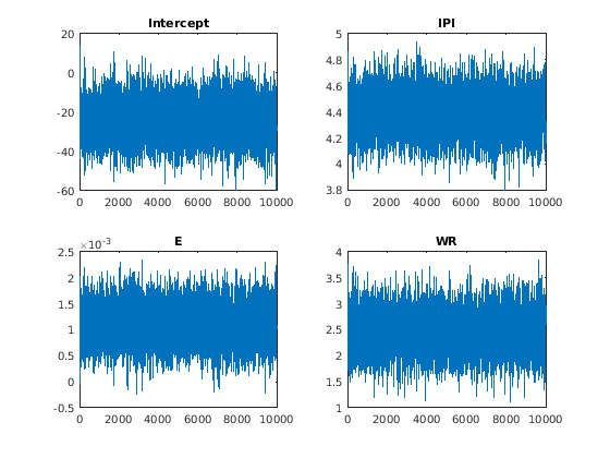 figure; for j = 1:(p + 1) subplot(2,2,j); plot(PosteriorMdl.BetaDraws(j,:)); title(sprintf('%s',PosteriorMdl.VarNames{j})); end