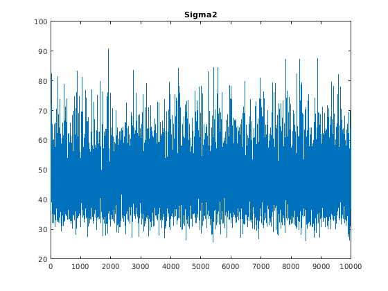 По умолчанию, estimate чертит и отбрасывает выборку выжигания дефектов размера 5,000. Однако это - хорошая практика, чтобы смотреть график трассировки ничьих для соответствующего смешивания и отсутствия быстротечности. Постройте график трассировки ничьих для каждого параметра. Можно получить доступ к ничьим, которые составляют распределение, то есть, свойства BetaDraws и Sigma2Draws, использование записи через точку.