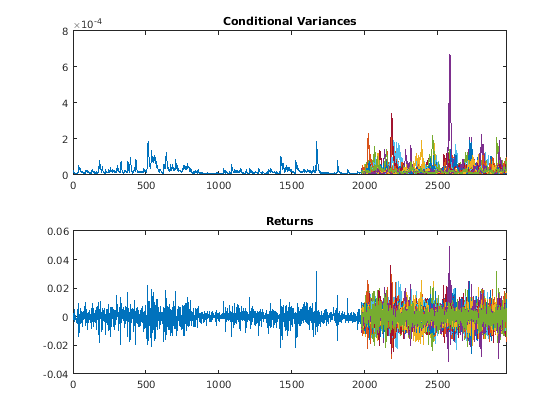 rng default; % For reproducibility [V,Y] = simulate(EstMdl,1000,'NumPaths',25,... 'E0',r,'V0',v0); figure subplot(2,1,1) plot(v0) hold on plot(T+1:T+1000,V) xlim([0,T+1000]) title('Conditional Variances') hold off subplot(2,1,2) plot(r) hold on plot(T+1:T+1000,Y) xlim([0,T+1000]) title('Returns') hold off