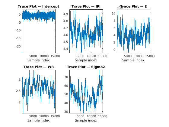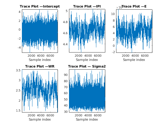 thin = 20; numDraws = 15e4/thin; PosteriorMdl2 = estimate(PriorMdl,X,y,'Thin',thin,'Width',width,... 'Reparameterize',true,'NumDraws',numDraws); figure; for j = 1:4 subplot(2,3,j) plot(PosteriorMdl2.BetaDraws(j,:)); axis tight xlabel('Sample index') title(sprintf(['Trace Plot ' char(8212) '%s'],PriorMdl.VarNames{j})); end subplot(2,3,5) plot(PosteriorMdl2.Sigma2Draws); axis tight xlabel('Sample index') title(['Trace Plot ' char(8212) ' Sigma2']); figure; for j = 1:4 subplot(2,3,j) autocorr(PosteriorMdl2.BetaDraws(j,:)); title(sprintf(['Correlogram ' char(8212) ' %s'],PriorMdl.VarNames{j})); end subplot(2,3,5) autocorr(PosteriorMdl2.Sigma2Draws); title(['Correlogram ' char(8212) ' Sigma2']);