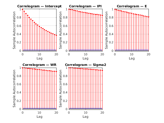 figure; for j = 1:4 subplot(2,3,j) plot(PosteriorMdl1.BetaDraws(j,:)); axis tight xlabel('Sample index') title(sprintf(['Trace Plot ' char(8212) ' %s'],PriorMdl.VarNames{j})); end subplot(2,3,5) plot(PosteriorMdl1.Sigma2Draws); axis tight xlabel('Sample index') title(['Trace Plot ' char(8212) ' Sigma2']); figure; for j = 1:4 subplot(2,3,j) autocorr(PosteriorMdl1.BetaDraws(j,:)); axis tight title(sprintf(['Correlogram ' char(8212) ' %s'],PriorMdl.VarNames{j})); end subplot(2,3,5) autocorr(PosteriorMdl1.Sigma2Draws); axis tight title(['Correlogram ' char(8212) ' Sigma2']);
