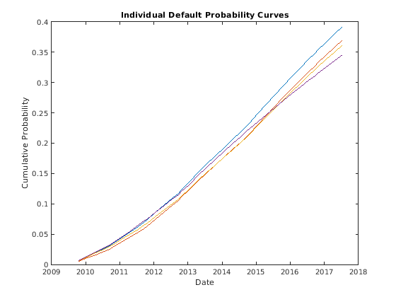 figure plot(ProbDates',DefProb) datetick title('Individual Default Probability Curves') ylabel('Cumulative Probability') xlabel('Date')