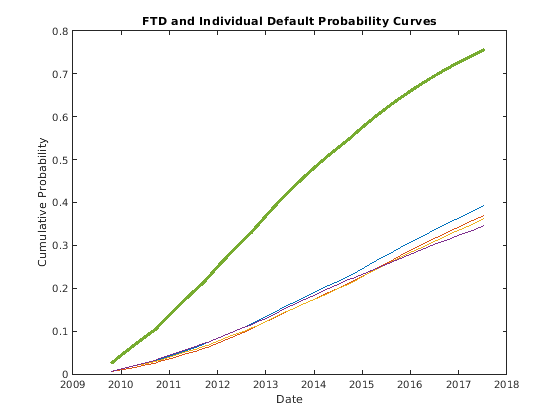 figure plot(ProbDates',DefProb) datetick hold on plot(ProbDates,FTDDefProb,'LineWidth',3) datetick hold off title('FTD and Individual Default Probability Curves') ylabel('Cumulative Probability') xlabel('Date')