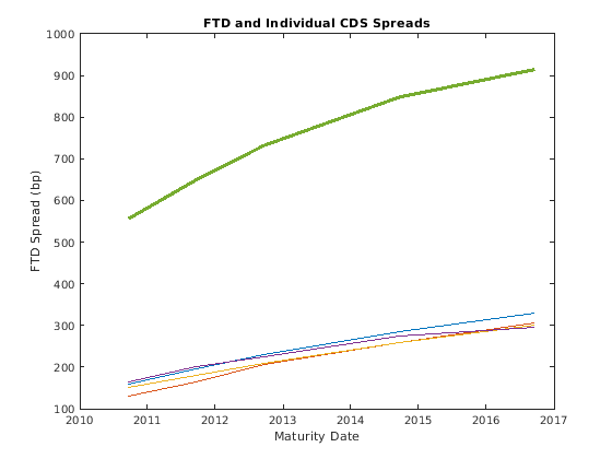 Maturity = MarketDates; ProbDataFTD = [ProbDates, FTDDefProb]; FTDSpread = cdsspread(ZeroData,ProbDataFTD,Settle,Maturity);