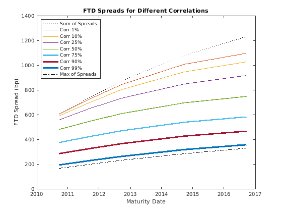 figure legends = cell(1,length(corr)); plot(MarketDates,FTDSpreadByCorr(:,1),'k:') legends{1} = 'Sum of Spreads'; datetick hold on for ii = 2:length(corr)-1 plot(MarketDates,FTDSpreadByCorr(:,ii),'LineWidth',3*corr(ii)) legends{ii} = ['Corr ' num2str(corr(ii)*100) '%']; end plot(MarketDates,FTDSpreadByCorr(:,end),'k-.') legends{end} = 'Max of Spreads'; hold off title('FTD Spreads for Different Correlations') ylabel('FTD Spread (bp)') xlabel('Maturity Date') legend(legends,'Location','NW')
