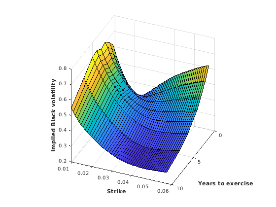 PlottingStrikes = (0.95:0.1:5.8)'/100; ComputedVols = zeros(length(PlottingStrikes), NumMaturities); for k = 1:NumMaturities ComputedVols(:,k) = blackvolbysabr(Alphas(k), Betas(k), Rhos(k), Nus(k), Settle, ... ExerciseDates(k), CurrentForwardValues(k), PlottingStrikes); end figure; surf(YearsToExercise, PlottingStrikes, ComputedVols); xlim([0 10]); ylim([0.0095 0.06]); zlim([0.2 0.8]); view(113,32); set(gca, 'Position', [0.13 0.11 0.775 0.815], ... 'PlotBoxAspectRatioMode', 'manual'); xlabel('Years to exercise', 'Fontweight', 'bold'); ylabel('Strike', 'Fontweight', 'bold'); zlabel('Implied Black volatility', 'Fontweight', 'bold');