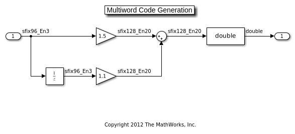 Эта модель показывает, как широкие операции целочисленной и фиксированной точки становятся многословными в сгенерированном коде C. Код многословный обычно инициирован при помощи параметров или сигналов с типами данных шире, чем C 'долго'.