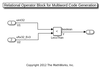 В примере Блока Оператора отношения ниже, вы ожидали бы получать функции многословные в сгенерированном коде. Эти два типа входных данных являются uint32 и ufix32_En3. Хороший тип для сравнения является ufix35_En3, потому что этот тип может представлять все значения реального мира обоих операндов.