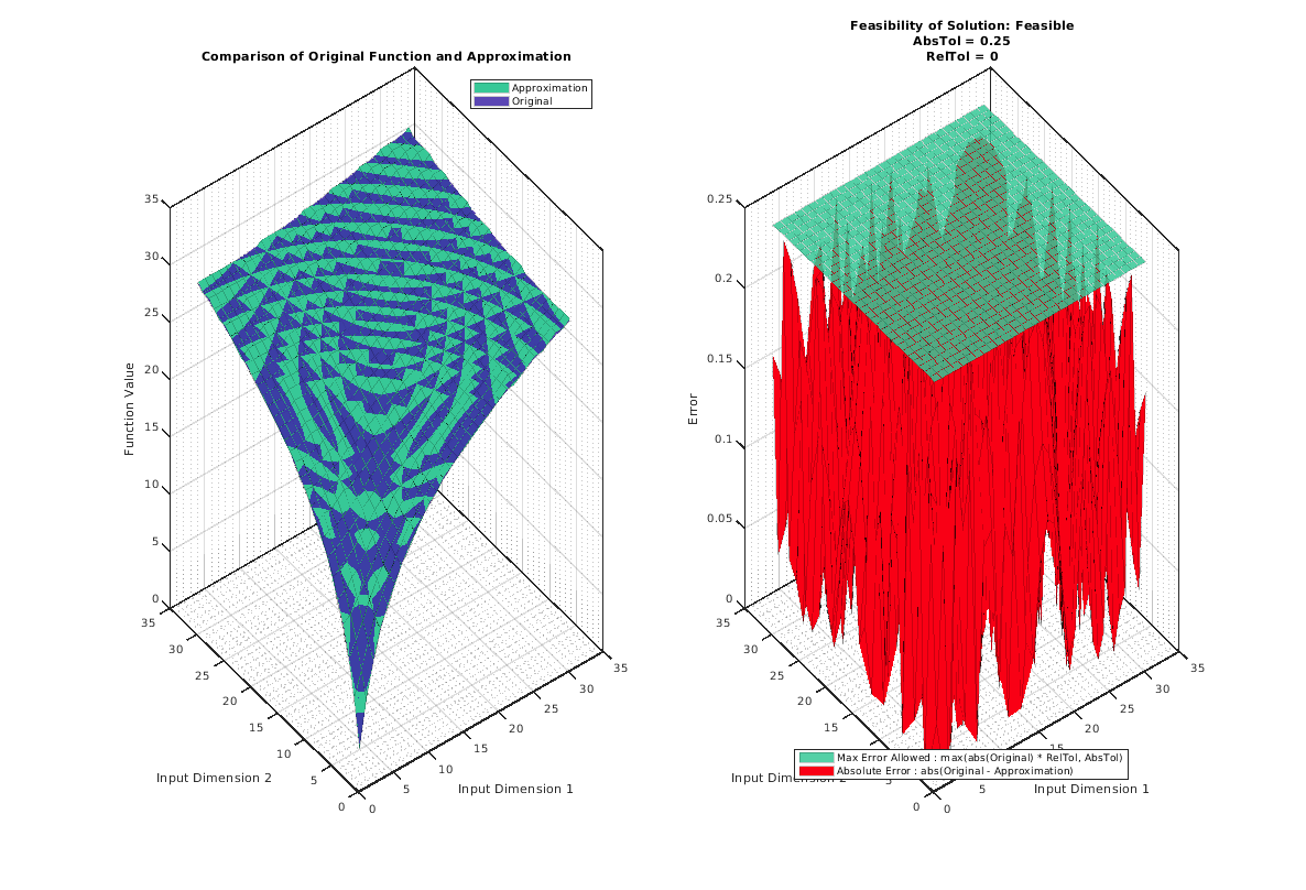 Сравните выход исходной функции и приближение интерполяционной таблицы. Левый график показывает выход исходной функции, определяемой в Problem объект и приближение интерполяционной таблицы. График справа показывает различие между выходом исходной функции и соответствующим выходом от сгенерированного приближения интерполяционной таблицы. Различие между этими двумя выходными параметрами меньше допуска, заданного в Options объект.