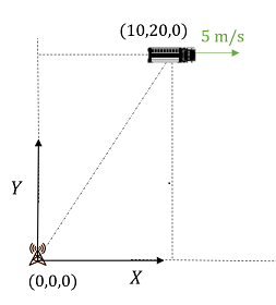Рассмотрите 2D сценарий отслеживания со стационарной башней и грузовиком. Башня, расположенная в начале координат системы координат сценария, оборудована радарным датчиком. В = 0 секунд, грузовик в положении (10,20,0) метры перемещается в положительном направление со скоростью 5 м/с.