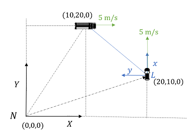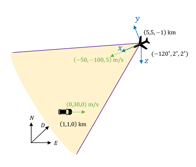 Рассмотрите беспилотное воздушное транспортное средство (UAV), контролирующее область. В = 0 секунд, UAV в положении (5,5,-1) км относительно глобального северо-востока вниз (NED) система координат. Скорость UAV (-50,-100,5) m/s. Ориентация системы координат тела UAV {,,} относительно глобальной системы координат NED дан как (-120,2,2) степени в области отклонения от курса, подачи и списка. В то же время автомобиль в положении (1,1,0) км перемещается на восток со скоростью 30 м/с, UAV измеряет автомобиль с помощью радиолокационной системы, выровненной с ее собственной связанной осью.