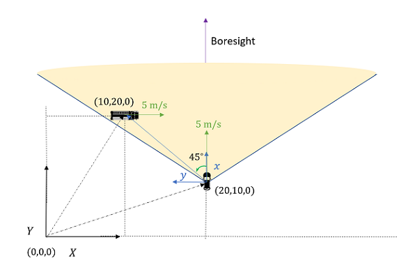 Рассмотрите предыдущий сценарий отслеживания, только теперь направление опорного направления радара вращает 45 градусов направление локальной системы координат автомобиля.