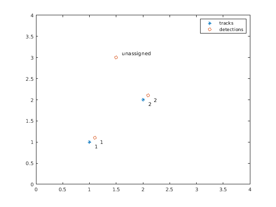 Стоимость каждого потенциального присвоения содержится в матрице стоимости, costmatrix. Каждая матричная запись представляет стоимость возможные присвоения. Строки матрицы представляют дорожки, и столбцы представляют обнаружения. Все возможные присвоения представлены в матрице стоимости. Чем ниже стоимость, тем более вероятно присвоение должно быть сделано. Каждая дорожка может быть присвоена самое большее одному обнаружению, и каждое обнаружение может быть присвоено самое большее одной дорожке. Если количество строк больше количества столбцов, некоторые дорожки являются неприсвоенными. Если количество столбцов больше количества строк, некоторые обнаружения являются неприсвоенными. Можно установить запись costmatrix к Inf запретить присвоение.