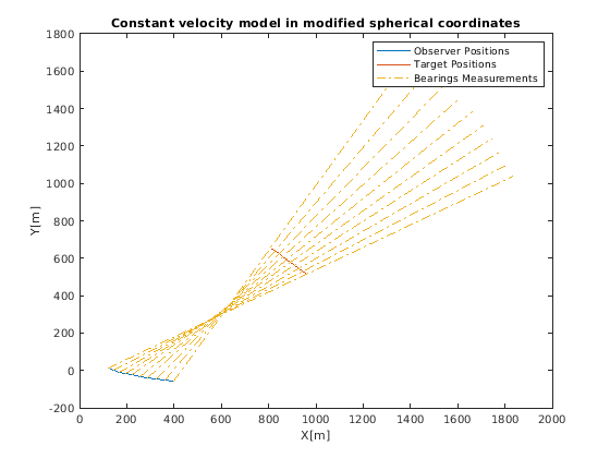 Состояние, которое задано относительно наблюдателя в модифицированных сферических координатах, задало как вектор или 2D матрица. Например, если существует постоянное скоростное целевое состояние, xT, и постоянное скоростное состояние наблюдателя, xO, то state задан как xT - xO, преобразованный в модифицированные сферические координаты.