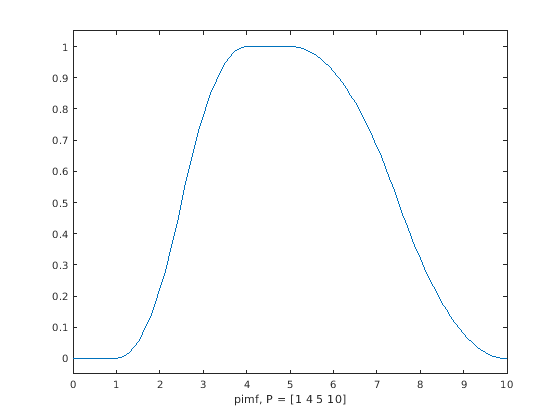 возвращает вычисленное использование значений нечеткого членства основанной на сплайне функции принадлежности, имеющей форму пи. Эта функция принадлежности является продуктом y = pimf(x,params)smf функционируйте и zmf функцией, и дают: