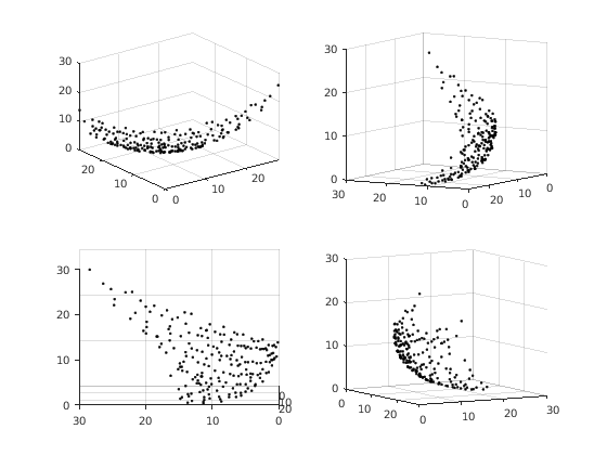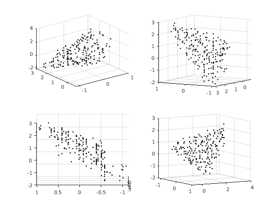 figure subplot(2,2,1) scatter3(x(:,1),x(:,2),x(:,3),'k.'); subplot(2,2,2) scatter3(x(:,1),x(:,2),x(:,3),'k.'); view(-148,8) subplot(2,2,3) scatter3(x(:,1),x(:,2),x(:,3),'k.'); view(-180,8) subplot(2,2,4) scatter3(x(:,1),x(:,2),x(:,3),'k.'); view(-300,8)