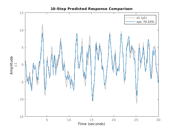 compare( также предсказывает ответ data,sys,kstep)sys, использование горизонта прогноза задано kstep. Прогноз использует выходные измерения, а также входные измерения, чтобы спроектировать будущий ответ. kstep представляет количество выборок времени между моментом времени каждого выходного измерения и моментом времени получившегося предсказанного ответа. Для получения дополнительной информации о прогнозе смотрите, Симулируют и Предсказывают Идентифицированный Выход Модели.