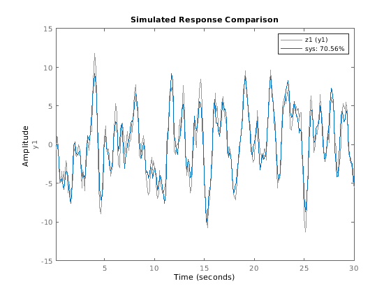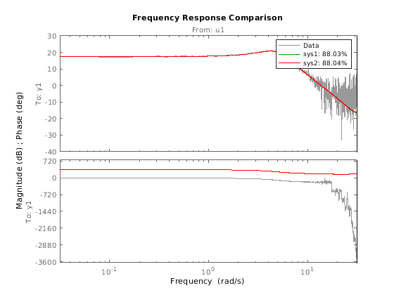 compare( симулирует ответ модели динамической системы и наложения что ответ по отображенным на графике данным об измерении. График также отображает нормированное среднеквадратичное значение (NRMSE) мера совершенства подгонки между симулированными данными об ответе и измерении. Используйте эту функцию, когда это необходимо, чтобы оценить набор моделей кандидата, идентифицированных из тех же данных об измерении, или, когда это необходимо, подтвердить модель, которую вы выбрали. Можно использовать data,sys)compare с временным интервалом или моделями частотного диапазона и данными.