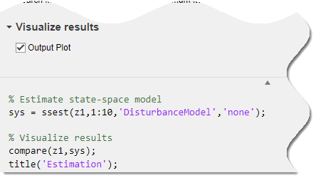 В блоке кода в вашем скрипте введите соответствующее ключевое слово, такое как state, space, или estimate. Выберите Estimate State Space Model от предложенных завершений команды.