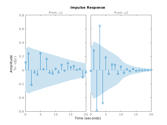 Для данных временного интервала, resid строит автокорреляцию остаточных значений и взаимную корреляцию остаточных значений с входными сигналами. Корреляции сгенерированы для задержек-25 к 25. Чтобы задать различное максимальное значение задержки, используйте residOptions. 99%-я область уверенности, отмечающая статистически незначительные корреляции, отображается как теневая область вокруг Оси X.