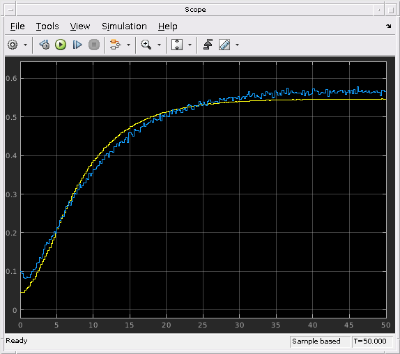 Запустите симуляцию снова и просмотрите различие между измеренным выходом и выходом модели в блоке Scope. Различие между измеренными и симулированными ответами теперь уменьшается.