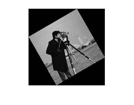 scale = 0.7; J = imresize(original,scale); % Try varying the scale factor. theta = 30; distorted = imrotate(J,theta); % Try varying the angle, theta. figure imshow(distorted)