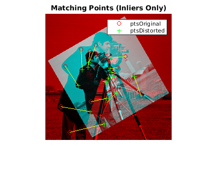 figure showMatchedFeatures(original,distorted,inlierOriginal,inlierDistorted); title('Matching Points (Inliers Only)'); legend('ptsOriginal','ptsDistorted');