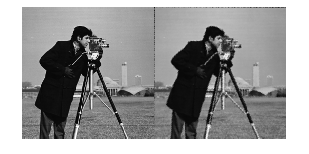 recovered (справа) качество изображения не совпадает с original (слева) отобразите из-за процесса искажения и восстановления. В частности, изображение, уменьшая потерю причин информации. Артефакты вокруг ребер происходят из-за ограниченной точности преобразования. Если необходимо было обнаружить больше точек на Шаге 4: Найдите Соответствие с Функциями Между Изображениями, затем преобразование было бы более точным. Например, вы, возможно, использовали угловой детектор, detectFASTFeatures, дополнять анализатор SURF, который находит блобы. Содержимое изображения и размер изображения также влияют на количество обнаруженных функций.